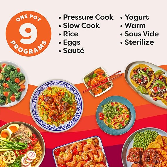 • 9 Cooking Functions: Pressure cook, slow cook, sauté, sous vide, steam, steralize, keep warm, make rice and yogurt—all in one appliance.